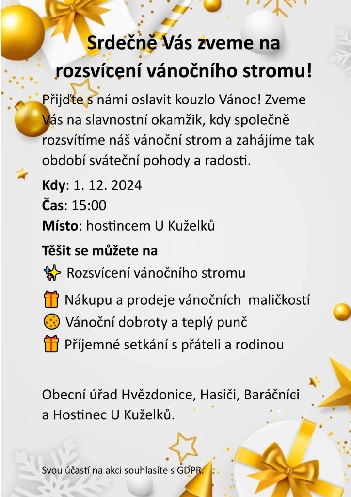 Obecní úřad Hvězdonice, Hasiči, Baráčníci a Hostinec U Kuželků vás srdečně zvou na rozsvícení vánočního stromu, které se uskuteční 1. prosince 2024 od 15:00. Těšit se můžete na nákup vánočních maličkostí, vánoční dobroty a příjemné setkání s přáteli.